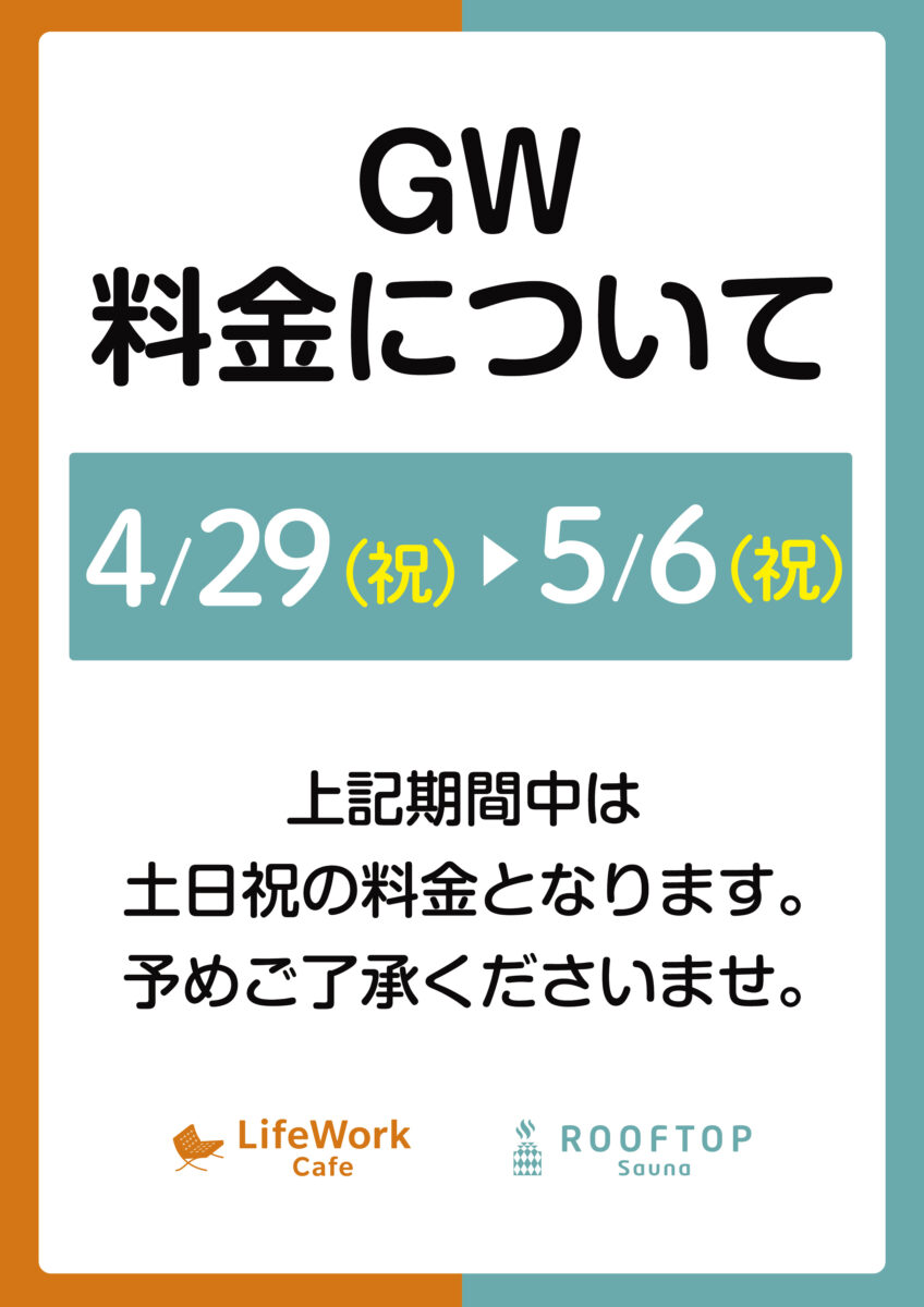 いつもROOFTOP/LifeWorkをご利用いただき誠にありがとうございます。 4/29(水祝)〜5/6(水祝)の期間は、土日祝日ご料金でのご案内となります。