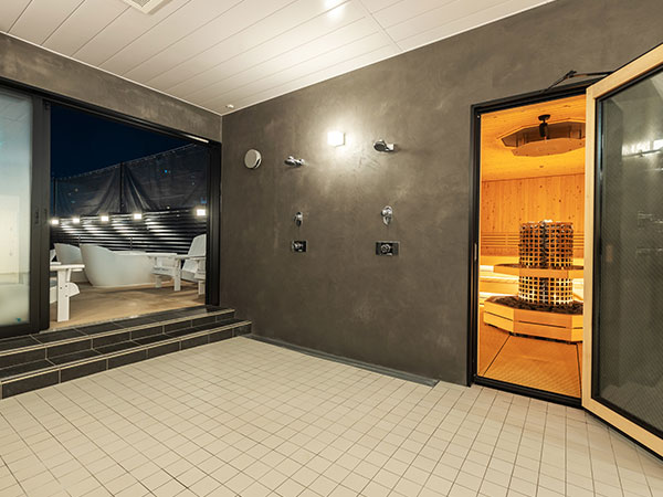 ペントハウススタイルで、ルーフトップに開放的で広々としたととのい場を設置しました。サウナから出て水風呂に浸かったら、すぐに外気浴のできるルーフトップへ。足を伸ばして寝ながら「ととのう」体験を存分に楽しめます。